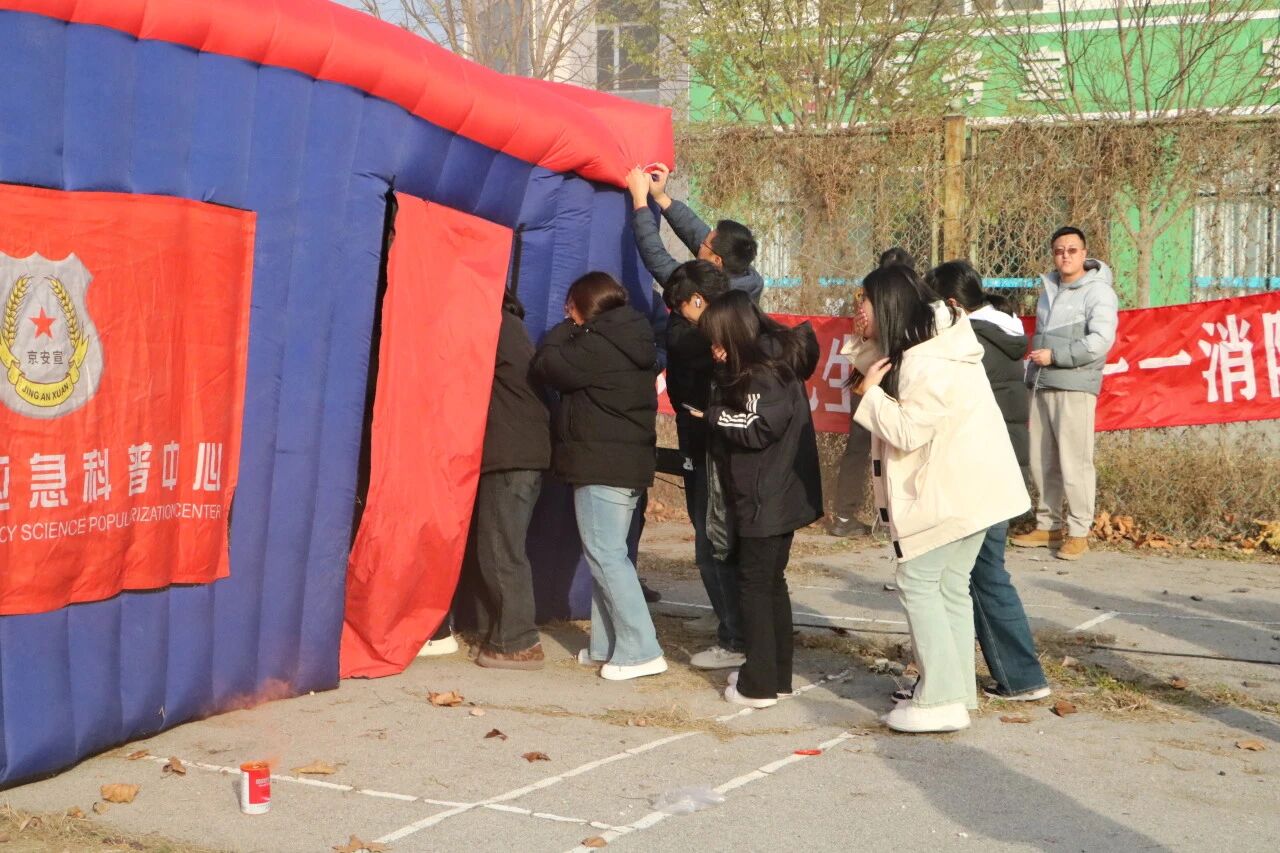 为增强培训实效,演练还设置了各类消防、应急体验环节。通过搭建模拟烟雾帐篷,参训学生在逼真环境中巩固逃生动作要领,沿指定路线快速撤离并在外部集合点完成打卡。紧急救护实操环节通过演示火灾晕厥人员的科学施救方法,进一步提升师生互救能力。