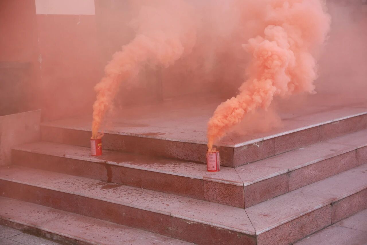 警报响起后,教学楼内师生按照疏散路线,采取弯腰低姿、湿毛巾捂口鼻等规范动作,迅速有序撤离。