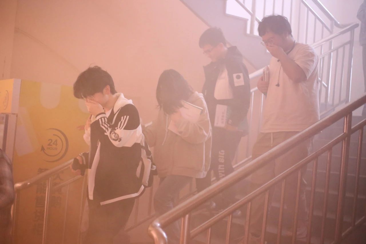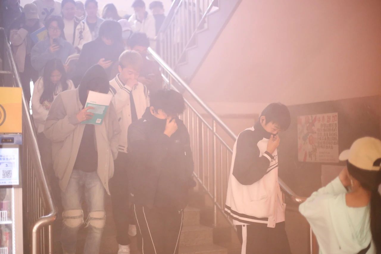 当火警警报声响起,师生们迅速反应,低头弯腰,捂住口鼻,快速有序地撤离了现场。