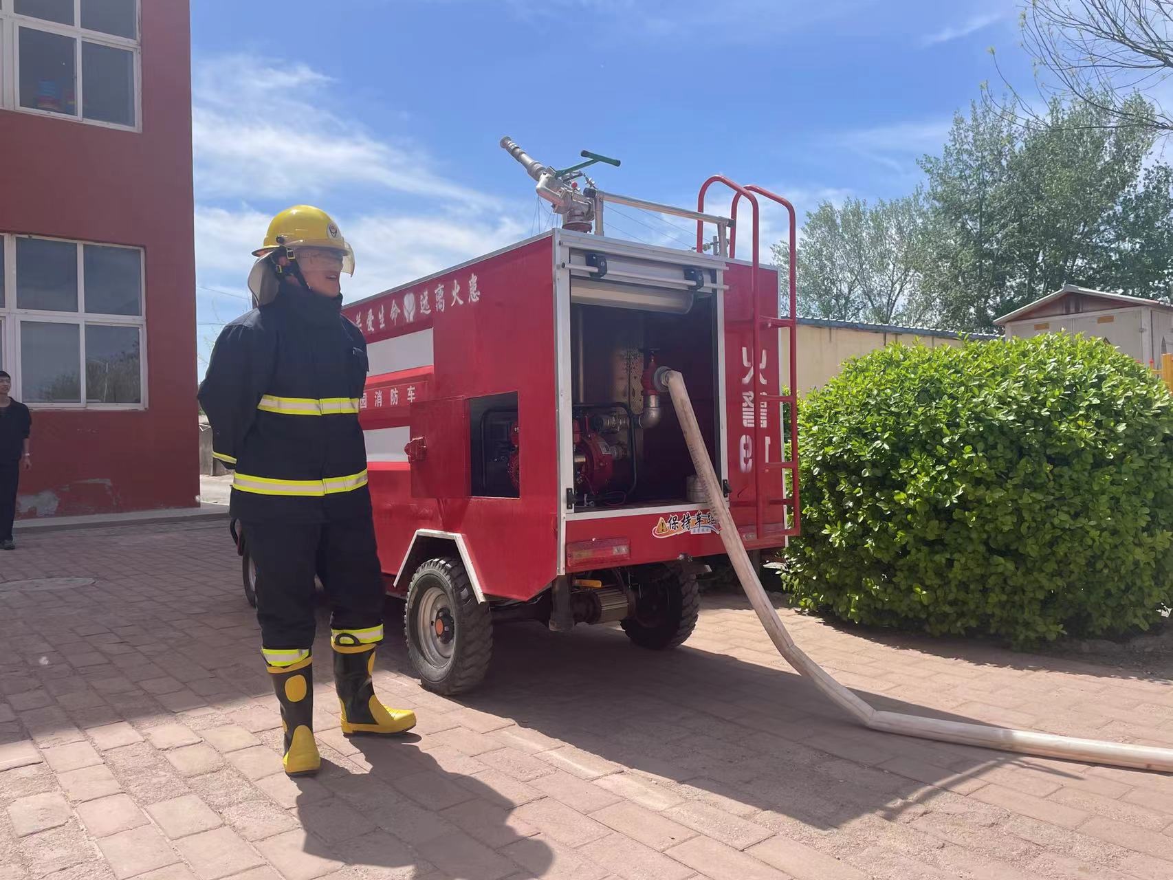 随后,应急处置小组人员向师生们展示了校园消防车的使用方法。