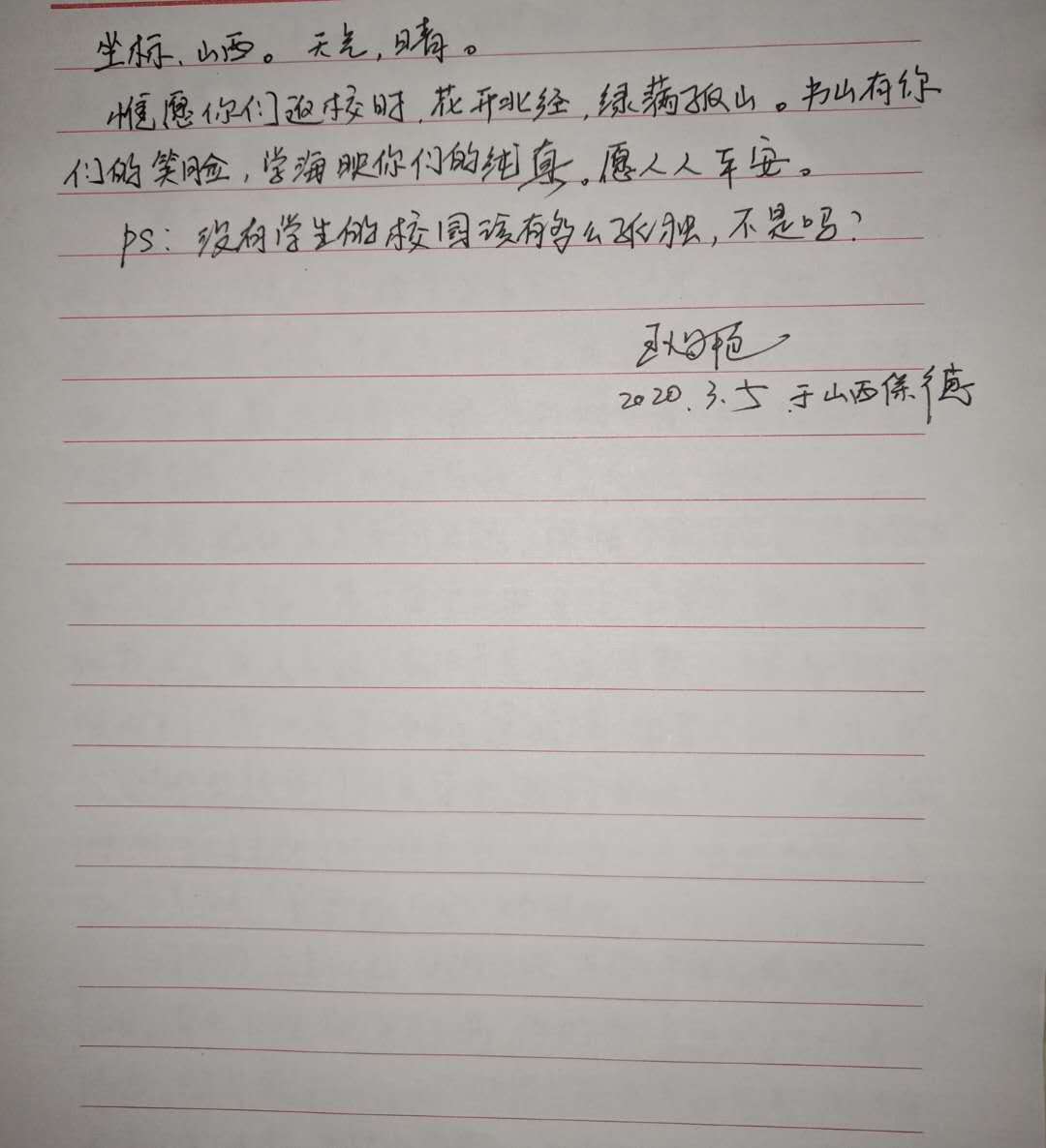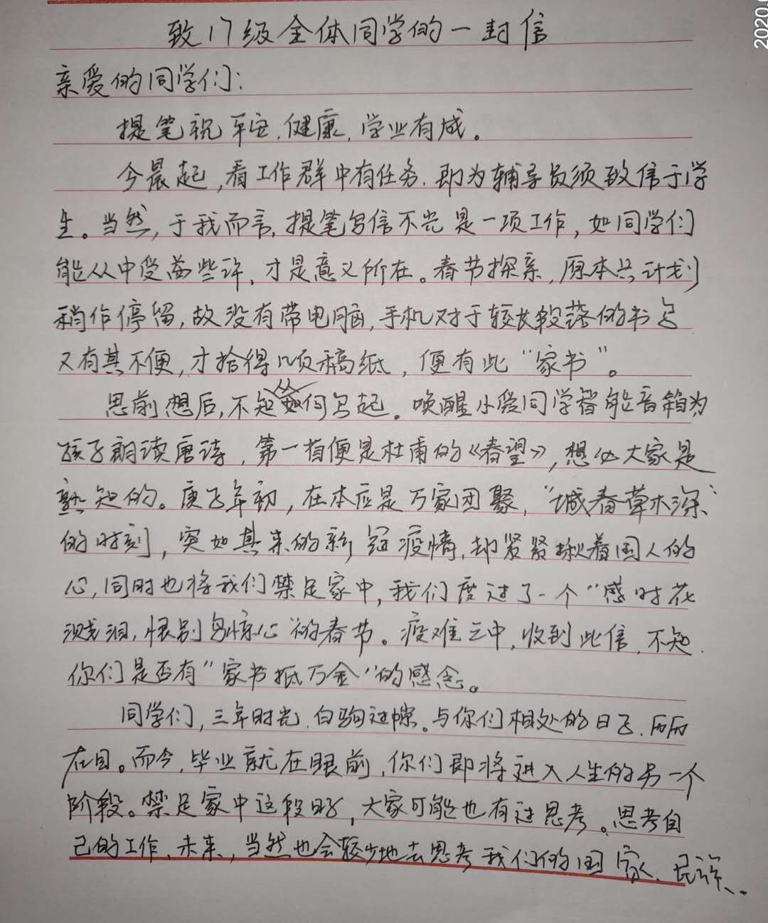 “虽然目前不开学,但同学们别忘了网上反馈身体健康状况,每天继续在群里反馈体温和所在具体位置。并认真关注老师在群里发的各种注意事项以及就业信息。因为我们毕竟是毕业班,面临的主要是就业问题。大家最好也要密切关注本地就业信息,争取在当地就业。因为北京外来人口太多,疫情隐患也大。我们不能冒险来北京求职。”-----摘自财经与管理学院17级辅导员鹿向亮《给同学们的一封信》