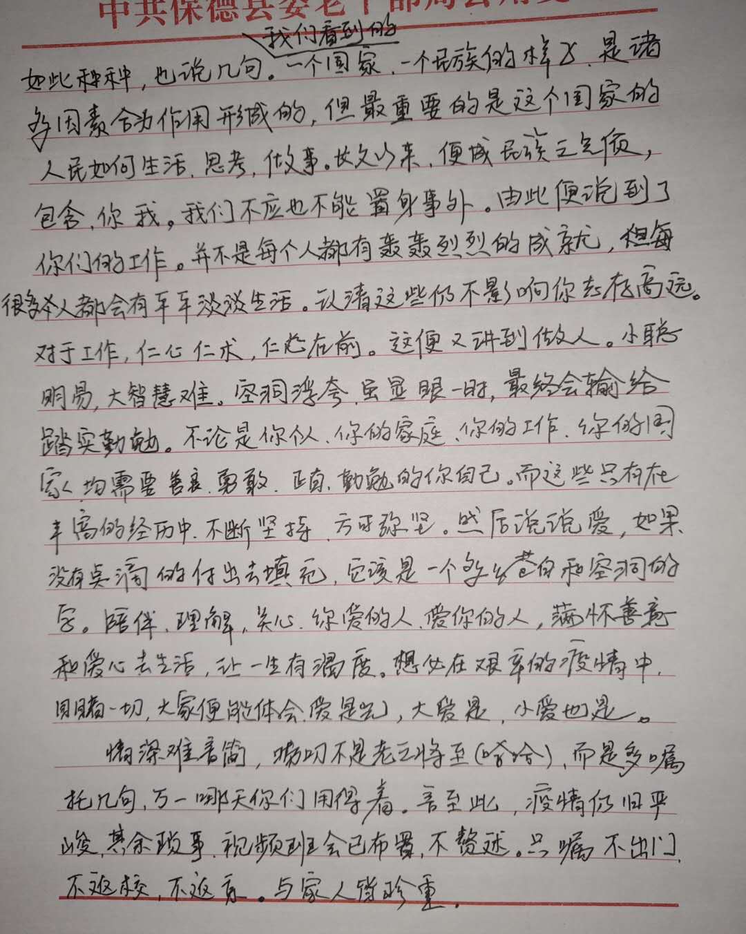 “我们看到的一个国家,一个民族的样子是诸多因素合力作用形成的,但最重要的是这个国家的人民如何生活、思考、做事。长久以来,便成民族之气质,包含你我,我们不应也不能置身事外,由此便说到了,你们的工作,并不是每个人都有轰轰到烈的成就,很多人都会有平平淡淡生活,认清这些仍不影响你志存高远。对于工作,仁心仁术,仁心在前。这便又讲到做人,小聪明易,大智慧难。空洞浮夸虽显眼一时,最终会输给踏实勤勉。不论是你个人,你的家庭,你的工作,你的国家,均需要善良、勇敢、正直、勒勉的你自己。而这些,只有在丰富的经历中,不断坚持方可弥坚。”-----摘自学前与健康学院17级辅导员王旭艳《致17级全体同学们的一封信》