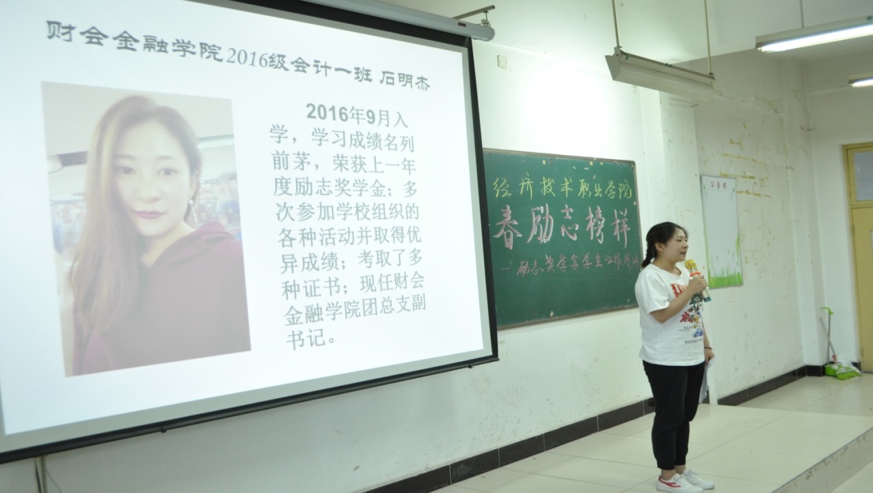 6月13日,在学院C阶梯二教室举行2017年国家励志奖学金获得者来自文化与传媒学院的王建林、孟欣、财会金融学院的李慧丰、石明杰、孙运欣、高佳佳同学、和信息工程学院的鹿金龙8位同学作了精彩演讲,二级学院副院长庄恒辉、杨金杰,资助管理中心孟宪云老师,雏鹰班150多名学生及5位辅导员参加。