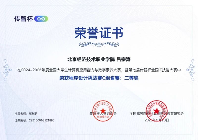 近日,第七届“传智杯”全国大学生IT技能大赛省级赛区成绩揭晓,bat365正版唯一官网信息工程系学子凭借扎实的专业功底与出色的创新能力,在激烈竞争中脱颖而出,斩获多项荣誉。其中,23级大数据技术专业的颜锦轩同学荣获C组一等奖,23级计算机应用技术专业的吕宗涛同学获得C组二等奖,23级软件技术专业的陈统州同学斩获B组二等奖,充分展现了学院在计算机编程与算法领域的教学成果和育人实力。
