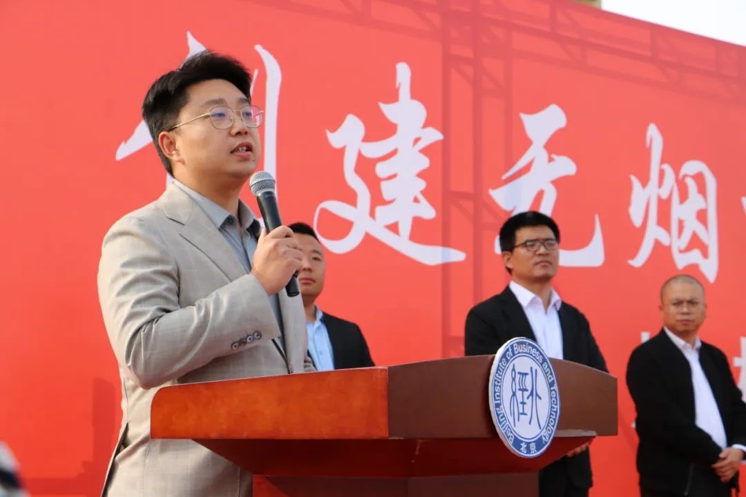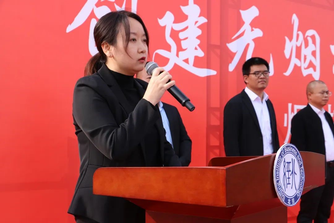 学生代表、2023级软件技术专业王廉正发言。他提议同学们要一起行动起来,远离香烟,为了争创良好的校风和学风,营造健康、文明、和谐的校园环境,一起努力!为养成良好文明的生活习惯,创设文明、洁净、优美的校园环境而共同奋斗!