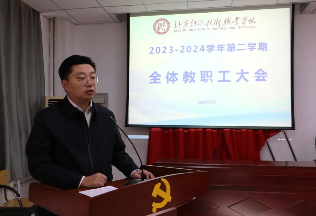会上,学院党委书记周宏传达了2024年北京高校领导干部会会议精神,要求全体教职工要将市委教育工委市教委紧扣“高质量”主题主线,研究制定的涵盖8个方面的 39 项重点任务与自己的岗位深入结合,加深对当前教育形势发展的认识,他对全体教职工提出了三点要求:要“高”,要以习近平新时代中国特色社会主义思想建立新生态新标准;要“新”,工作要营造新生态;要“实”,要立足见行动。随后,他从三个方面部署了2024年学院党建工作:一是认清形势,坚定信念。坚定以习近平总书记为核心的党中央确定的治国方略,按照学院的实际情况,团结进取,勤奋开拓,助力学院高质量发展。二是立足岗位,勤奋工作。全体教职工应立足本职工作勤奋工作,在自身提升方面下功夫。三是党建引领,师德为先。要抓好党建融合,抓好本职工作的落地,抓好德智体美劳品牌建设的推进,发挥学院特色,寻求新发展。