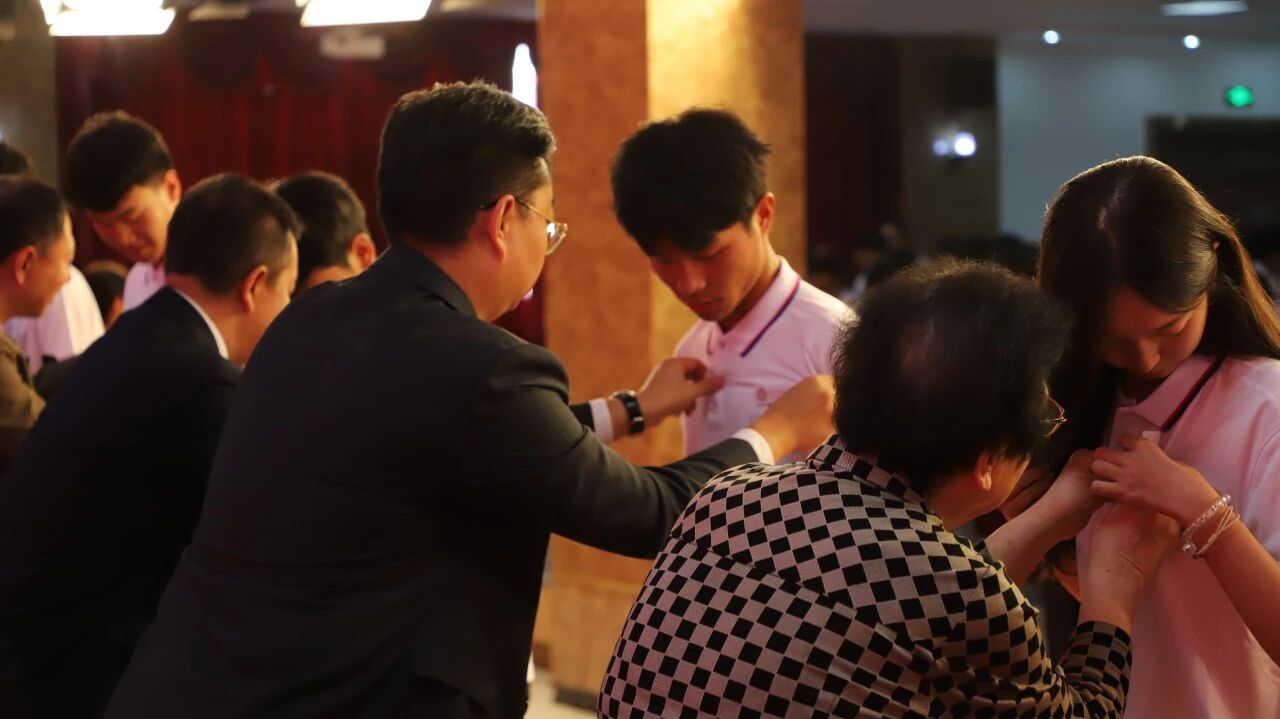 在全场的瞩目下,与会来宾及领导为新生代表佩戴校徽。一枚枚校徽闪耀胸前,不仅是身份的象征,更是责任的嘱托——从这一刻起,2025级新生正式成为学院大家庭的一员,与学院血脉相连。
